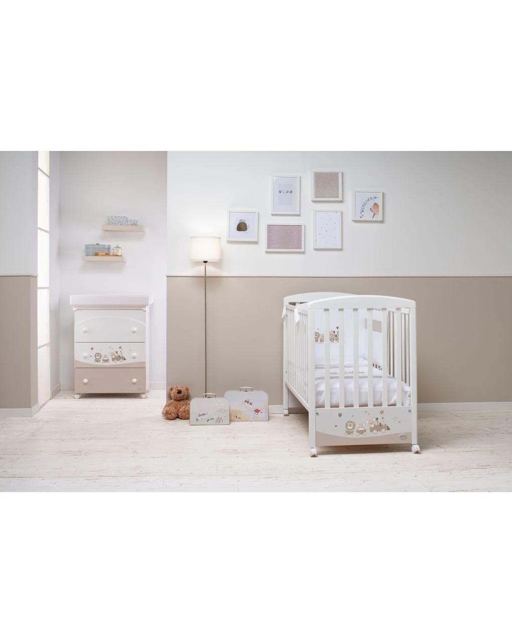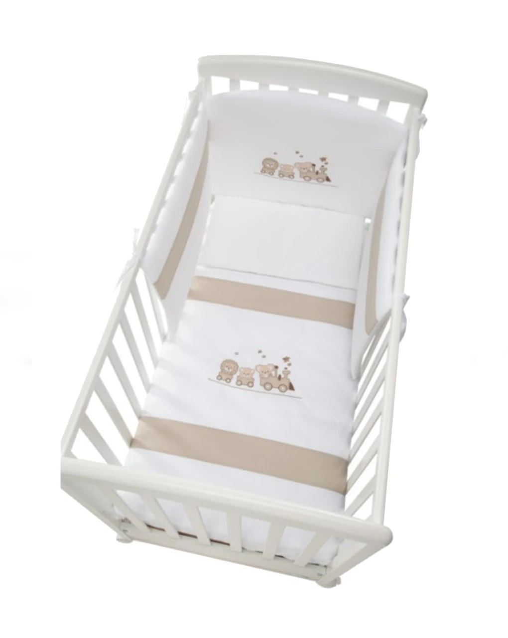 Il completo piumone è caratterizzato da un simpatico trenino con animaletti a bordo. Il set tessile è composto da paracolpi, sacco sfoderabile e federa per cuscino.