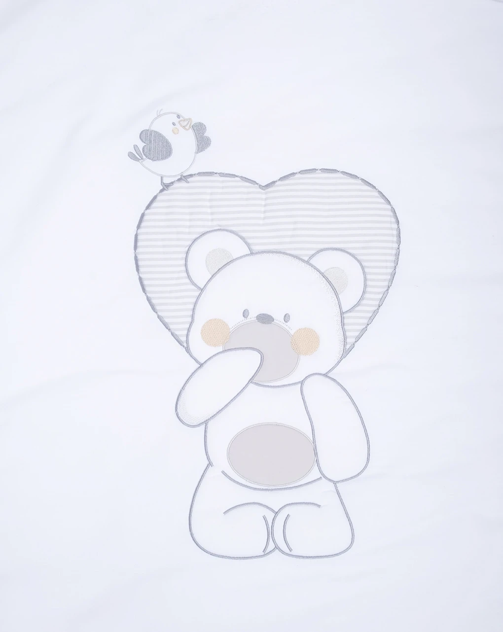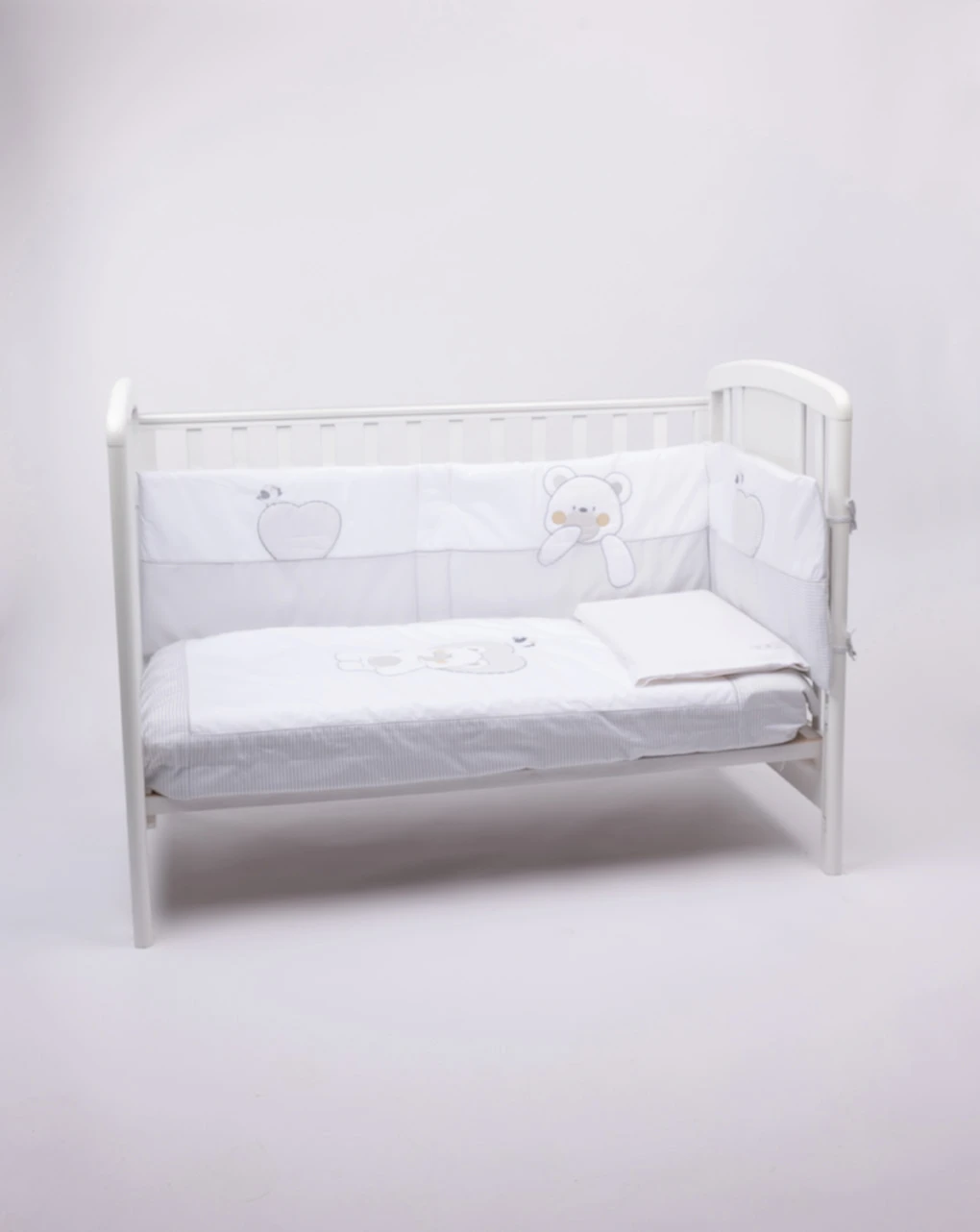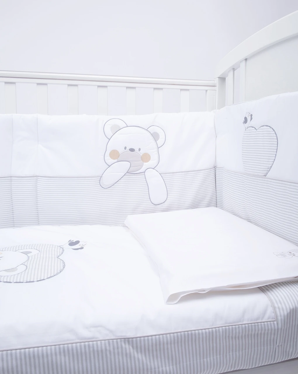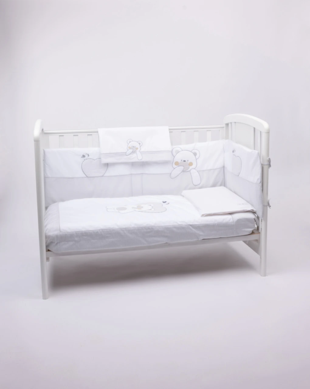 Tenero set letto 4 pezzi in 100% cotone. Il set si compone di federa 35×60 cm, sacco esterno 110×150 cm, piumino interno 70×140 cm e paracolpi 195×40 cm. I capi si sviluppano nei toni del bianco e del grigio e sono arricchiti da teneri orsetti, fantasie rigate e cuori. Il set è pratico e confortevole. Accessori non in vendita. La confezione contiene solo il capo d’abbigliamento