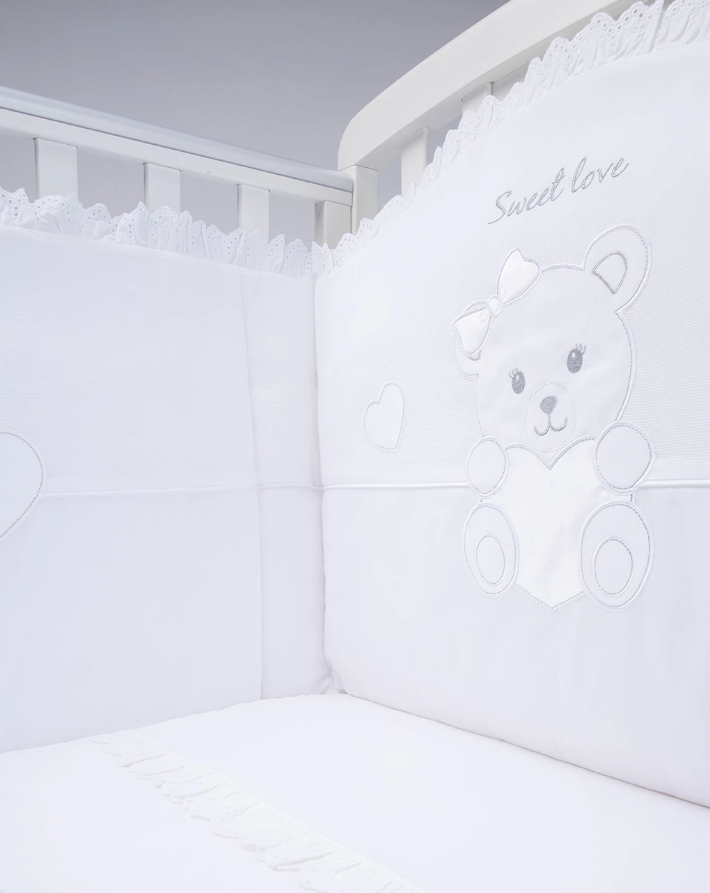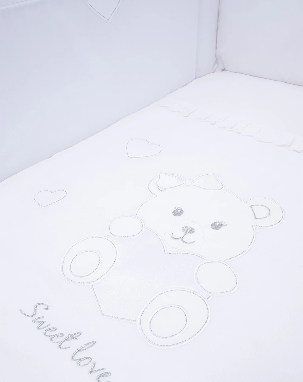 Tenero set letto 4 pezzi in 100% cotone. Il set si compone di federa 35×60 cm, sacco esterno 110×150 cm, piumino interno 70×140 cm e paracolpi 195×40 cm. I capi si sviluppano su sfondo bianco con stampa stilizzato “Orsetto” più scritta “Sweet Me” e dettagli in tonalità argentata. Il set è pratico e confortevole. Accessori non in vendita. La confezione contiene solo il capo d’abbigliamento