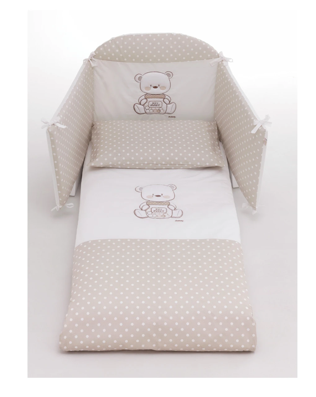 Completo sfilabile ricamato composto da: sacco piumone in cotone ricamato, imbottitura sfilabile con fodera in cotone e imbottitura in poliestere, paracolpi e federa per cuscino in cotone