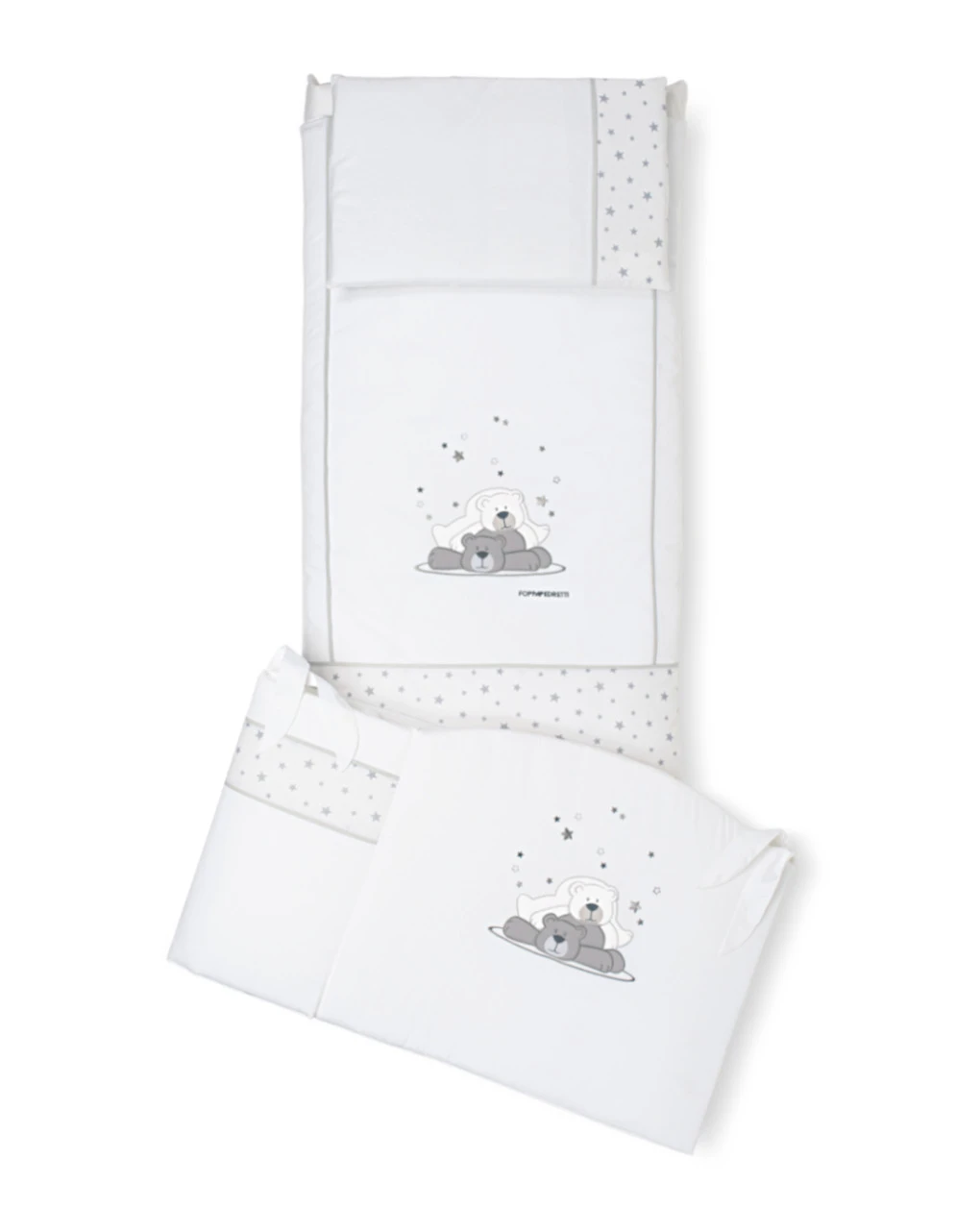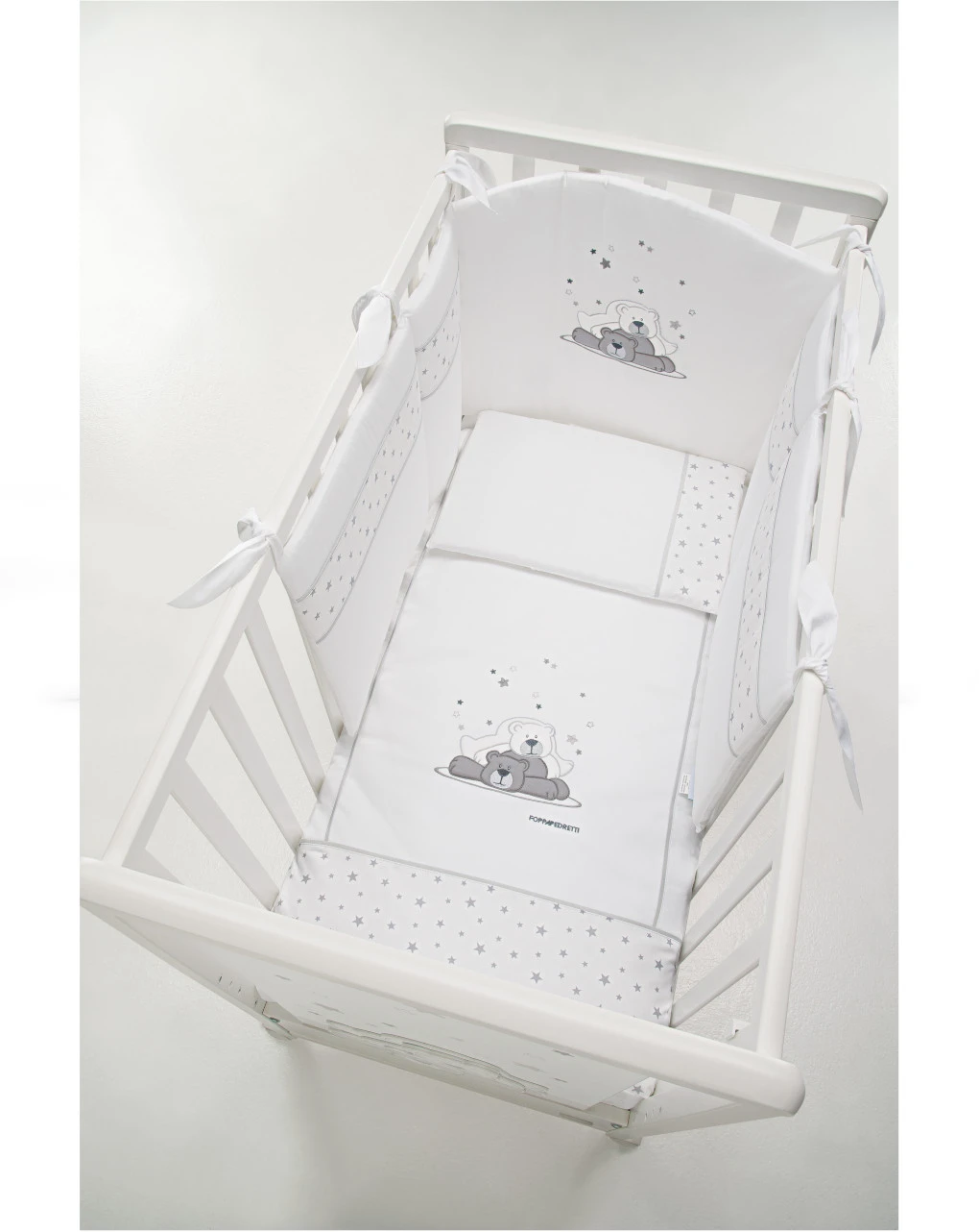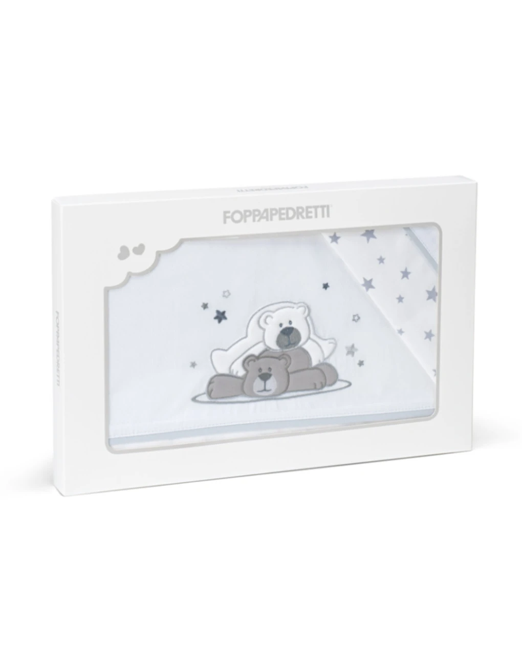 - Set caratterizzato da ricami con due teneri orsetti e tante stelline, nella tinta del grigio