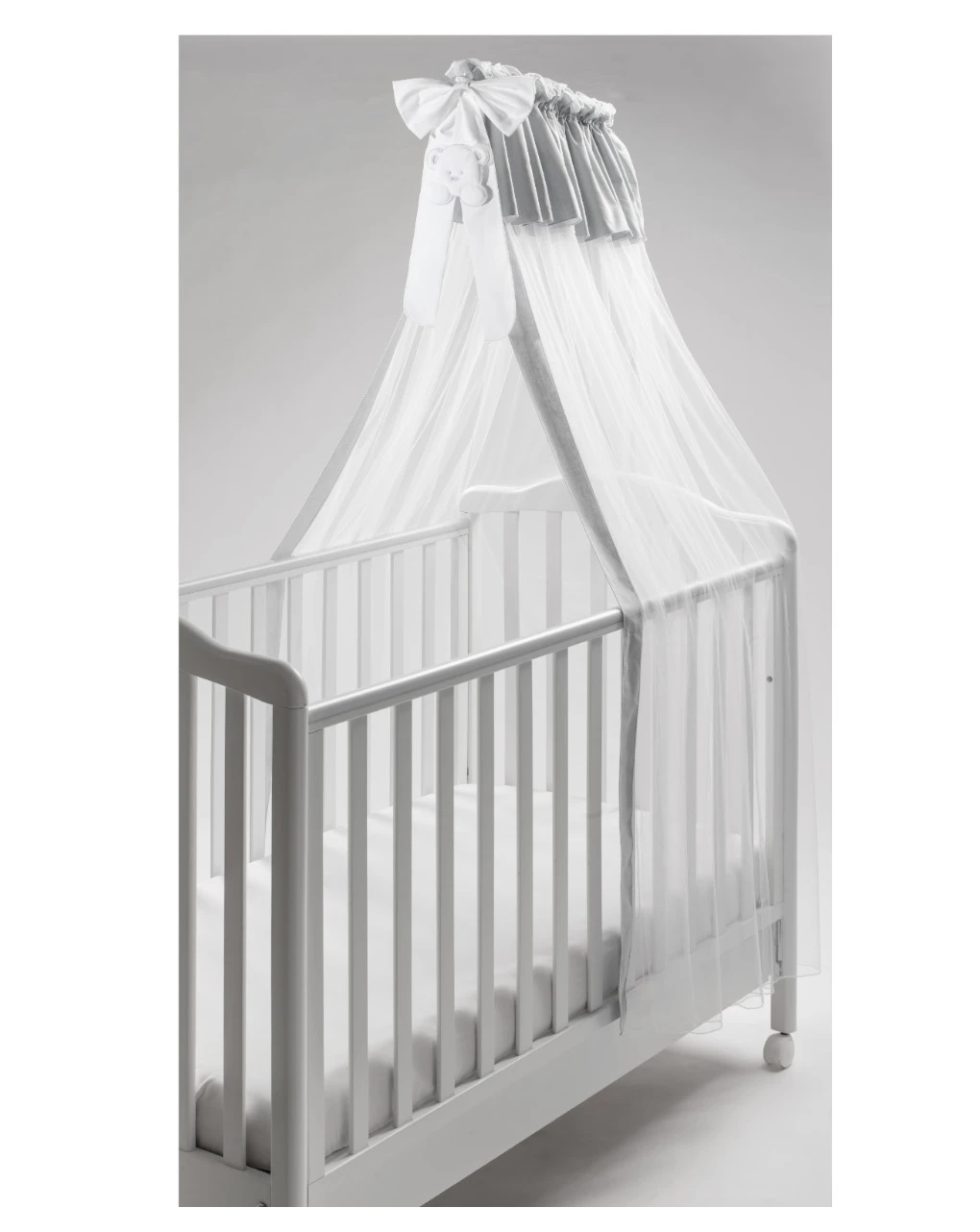Velo modello Testa Letto realizzato in tulle bianco con volant e balza superiore coordinata. Asta reggivelo laccata bianca con terminale dritto ed aggancio rapido inclusa